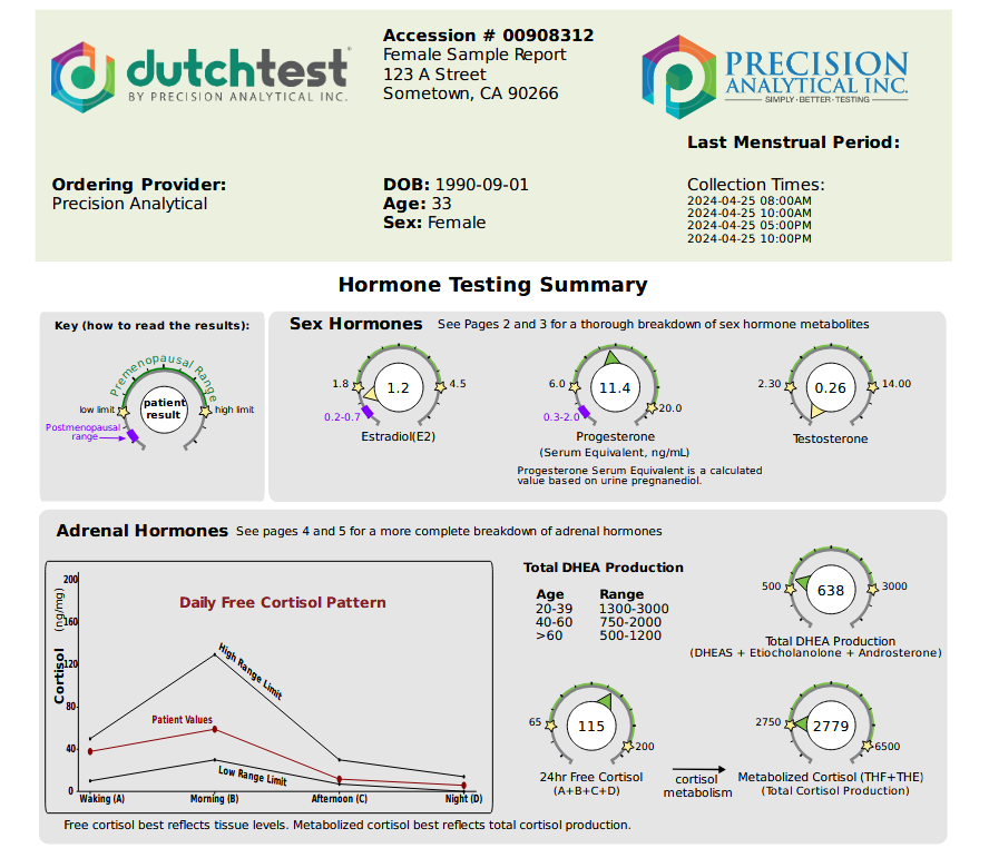 El DUTCH Test (Dried Urine Test for Comprehensive Hormones) es una de las pruebas más avanzadas y completas para evaluar la salud hormonal en mujeres en menopausia. No solo mide los niveles de estrógenos y progesterona, sino que también analiza cómo se metabolizan estas hormonas en el cuerpo. Esto es crucial para detectar riesgos de dominancia estrogénica, alteraciones en la función suprarrenal y problemas en la detoxificación hepática de los estrógenos.