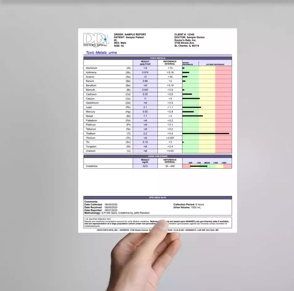 El análisis de los niveles de metales tóxicos en la orina después de la administración de un agente de desintoxicación de metales es una forma objetiva de evaluar la acumulación de metales tóxicos. La intoxicación aguda por metales es rara. Sin embargo, más común es la exposición crónica a niveles bajos de metales tóxicos que puede resultar en una retención significativa en el cuerpo que puede estar asociada con una amplia gama de efectos adversos para la salud y enfermedades crónicas.