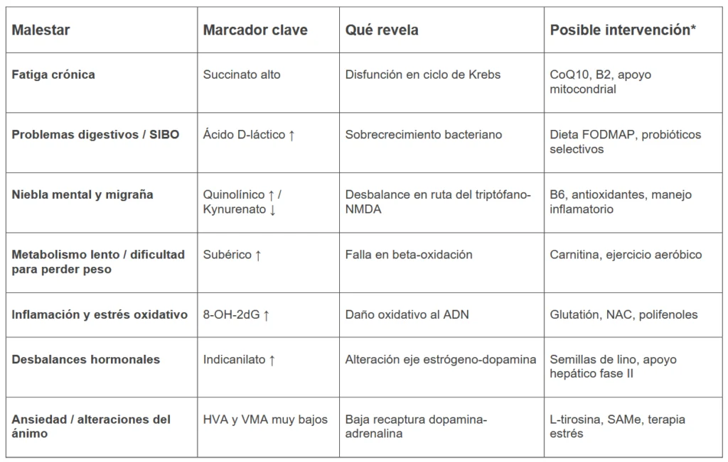 Cada metabolito actúa como un “semáforo”. Por ejemplo, elevación de ácido subérico señala bloqueo en la beta-oxidación de ácidos grasos (falla en obtener energía de la grasa), mientras que altos niveles de ácido D-láctico sugieren sobrecrecimiento bacteriano en intestino delgado (SIBO). Traducir estos patrones permite al médico personalizar nutrición, fitoterapia o ajustes farmacológicos.