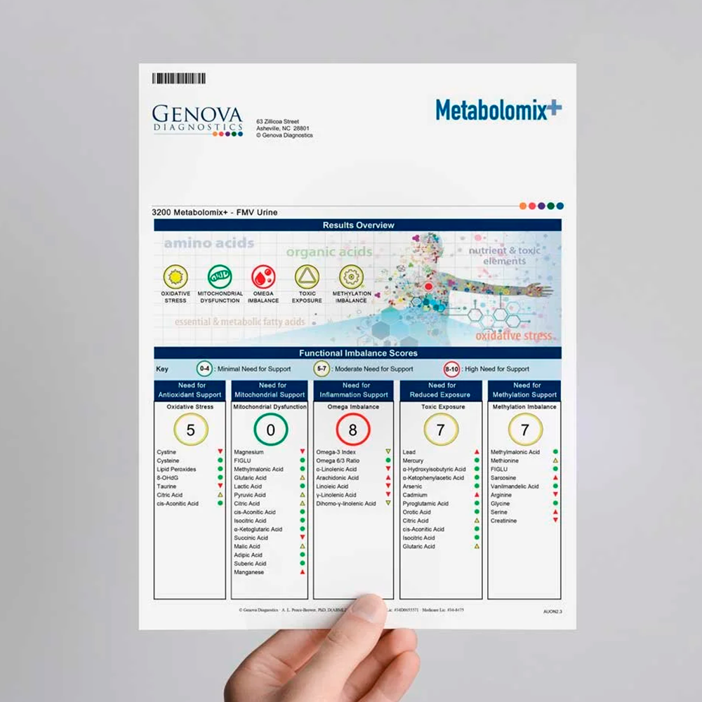 Se proporciona un conjunto completo de recomendaciones personalizadas para aminoácidos, ácidos grasos, vitaminas, minerales, apoyo digestivo y otros nutrientes para que puedas maximizar tu salud. Las pruebas también pueden revelar exposiciones tóxicas y medir la capacidad de tu cuerpo para neutralizar esas toxinas