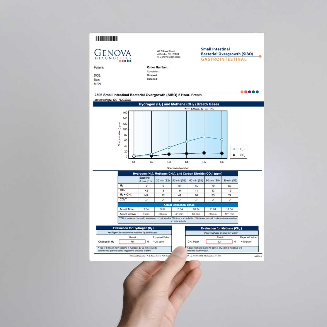 Los Perfiles de SIBO de Genova son pruebas de aliento no invasivas que capturan los gases exhalados de hidrógeno (H2) y metano (CH4) luego de que el paciente ingiere una solución de Lactulosa ℞ para evaluar el crecimiento bacteriano excesivo en el intestino delgado (SIBO, por sus siglas en inglés) y el crecimiento excesivo de metanógenos intestinales (IMO, por sus siglas en inglés). Los clínicos tienen la opción de realizar una evaluación de SIBO de 2 o 3 horas. El perfil de SIBO de 3 horas proporciona información sobre los niveles de gas en un período de tiempo más largo y se recomienda para pacientes con tránsito gastrointestinal más lento o estreñimiento. Además, un resultado plano en la tercera hora podría indicar la presencia de gas sulfhídrico.